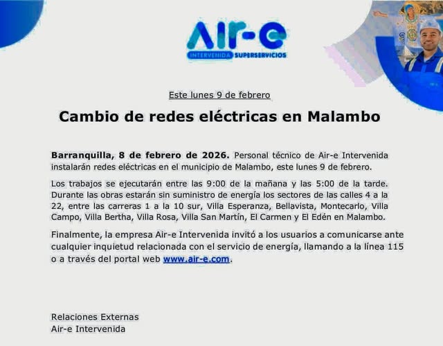 La empresa Air-e Intervenida informó a través de sus redes sociales sobre trabajos programados para el cambio e instalación de redes eléctricas en el municipio de Malambo, los cuales se realizarán este lunes 9 de febrero.