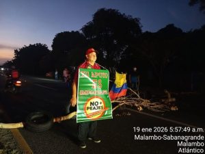 El comité “No al Peaje” inició una jornada de bloqueo en la vía oriental a la altura de Sabanagrande, exigiendo el retiro de los peajes y el cumplimiento del anuncio del gobierno nacional sobre la eliminación de casetas en el corredor Atlántico-Bolívar.