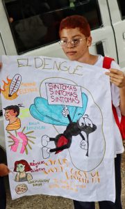Estudiantes de primaria de la Institución Educativa San Antonio de Piojó, como Isaac Augusto Jiménez y Saray Nicolle Goenaga, en una actividad lúdica con la Secretaría de Salud Departamental aprendieron a cuidar el agua de los tanques, a limpiarlos y a mantener peces para el control larvario. Matías David González Bolaño. a sus 9 años de edad, hizo un llamado a la comunidad para cuidar a su familia y a su pueblo de la enfermedad.