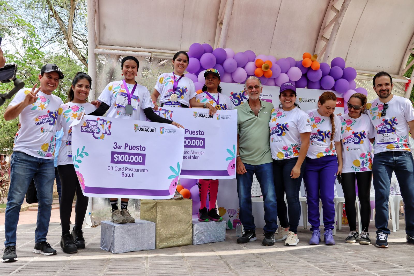 Ante de subir al pódium, el gobernador Verano, junto a la secretaria de la Mujer y Equidad de Género, la secretaria de Cultura y Patrimonio del Atlántico, Verónica Cantillo, la diputada Alejandra Moreno, el director de Indeportes, Iván Urquijo, el alcalde de Usiacurí, la primera gestora municipal, Karen Infante y otros funcionarios del orden local y departamental, hicieron entrega de las medallas y premios a las ganadoras de los primeros lugares de la carrera.