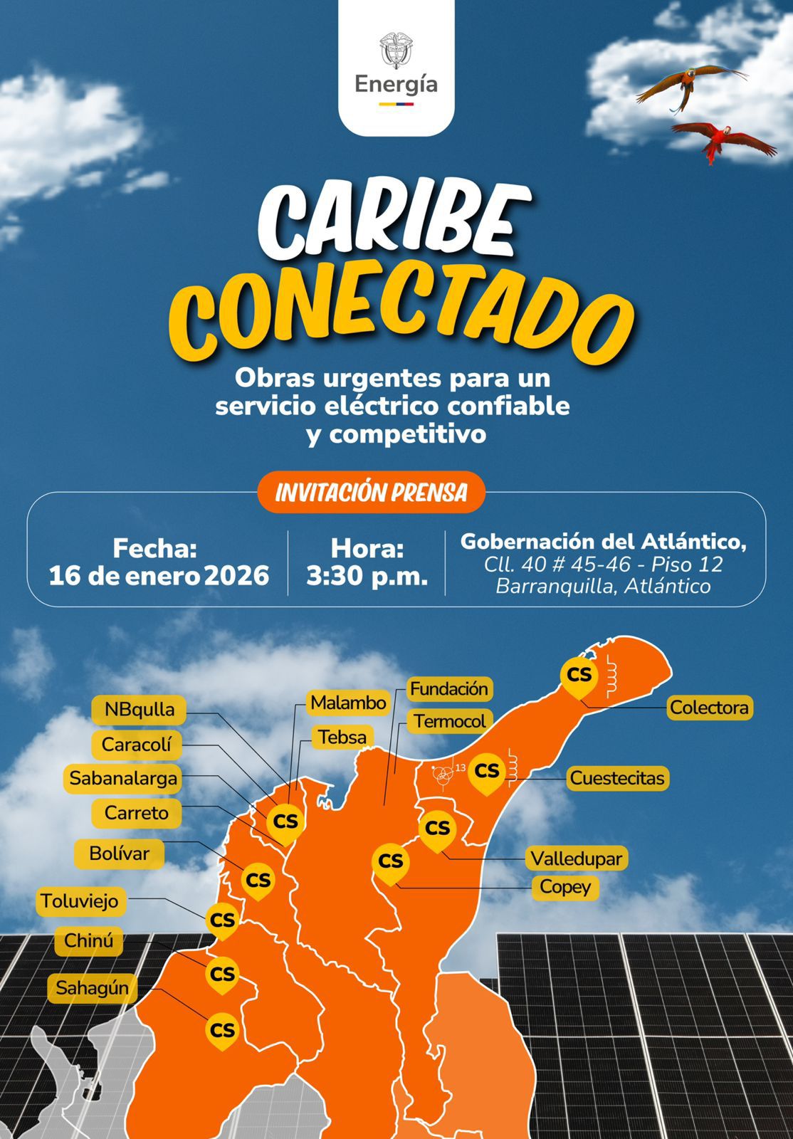 Este viernes 16 de enero, a las 2:00 p.m., el Ministerio de Minas y Energía se reunirá con los gobernadores de la RAP Caribe en el piso 12 de la Gobernación del Atlántico (Calle 40 # 45-46), para avanzar en la socialización de las obras urgentes de transmisión y distribución eléctrica.