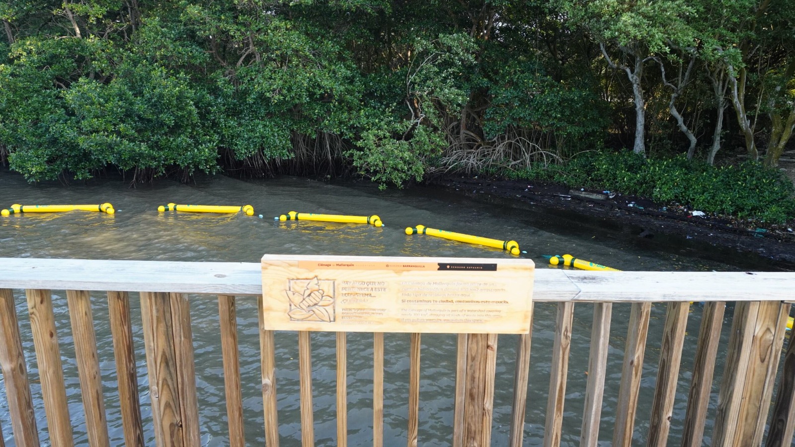 En el Ecoparque Ciénaga de Mallorquín se instalaron retenedores flotantes como una estrategia piloto para interceptar residuos sólidos que circulan por el cuerpo de agua, evitando que lleguen a zonas sensibles del manglar, un ecosistema clave para la biodiversidad y la regulación ambiental del territorio, como parte de las acciones concretas que viene liderando el alcalde Alejandro Char para avanzar en la conservación de este importante cuerpo de agua.