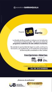 Para mayores informes e inscripción, los bachilleres interesados deben ingresar al siguiente enlace: https://www.unibarranquilla.edu.co/academia/iub-al-barrio