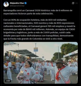 “Esto demuestra que el Carnaval moviliza la identidad, la tradición y la cultura popular”, afirmó Char, al subrayar que la Alcaldía destinó más de $20.000 millones para fortalecer el ecosistema cultural y creativo.