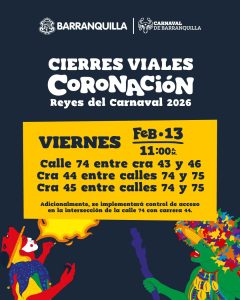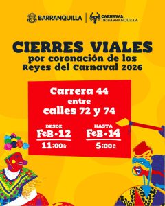 Llegó el momento de la coronación de los reyes del Carnaval 2026 y para gozarlo con seguridad se programó el cierre total temporal de la carrera 44 entre calles 72 y 74: