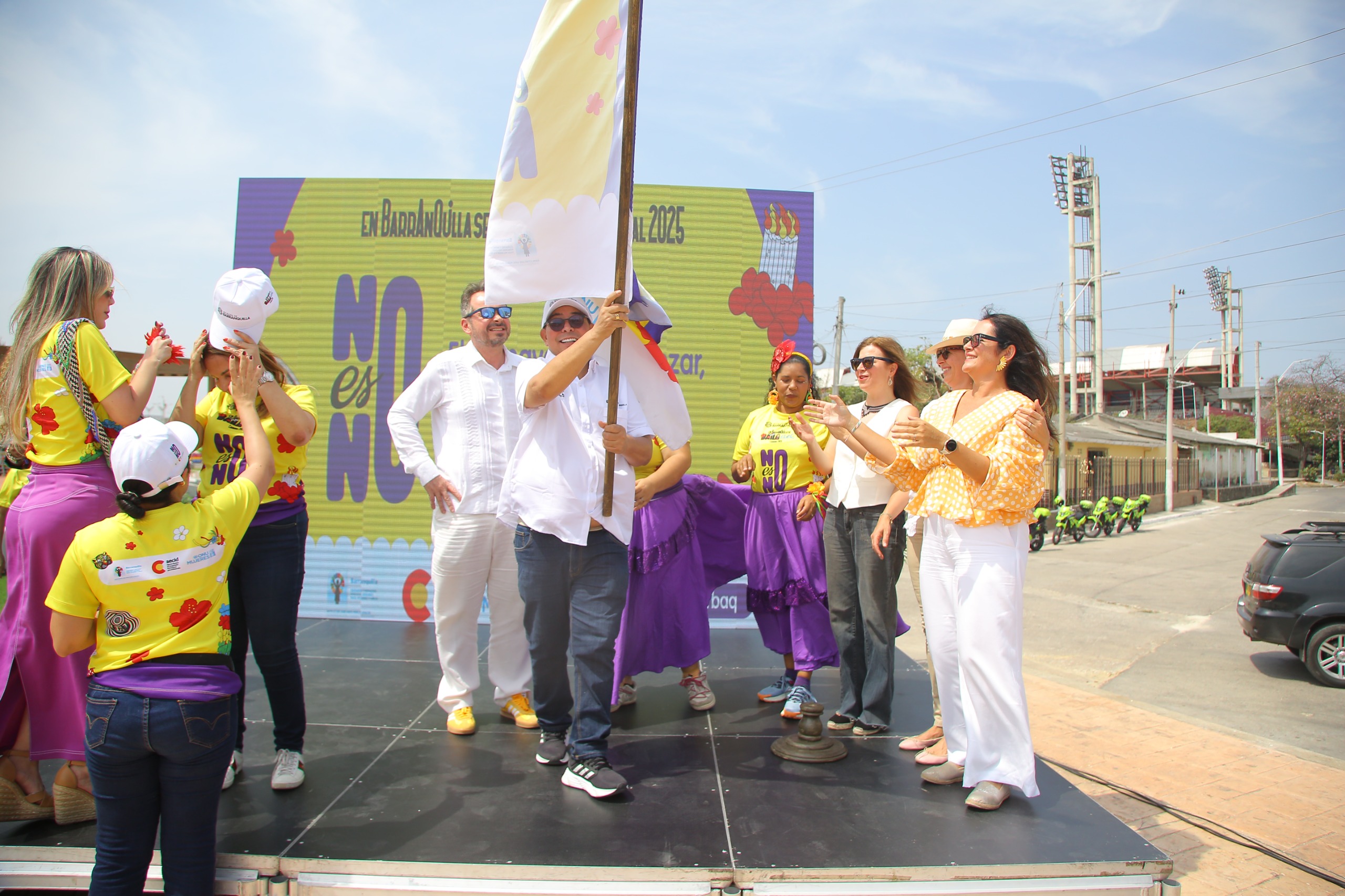 Con un recorrido por el barrio Rebolo, que finalizó en el Malecón de este popular barrio, se oficializó este viernes la izada de bandera de la campaña ‘No es No’. Este acto simbólico da inicio al Carnaval con el compromiso de promover una fiesta libre y segura para todas las mujeres y niñas, y para reiterar que ‘No es No’ es la consigna en cada rincón del Carnaval de Barranquilla.