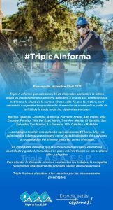 Triple A recomendó a los usuarios abastecerse previamente de agua para atender sus necesidades durante la intervención y ofreció disculpas por los inconvenientes que estas labores puedan ocasionar.