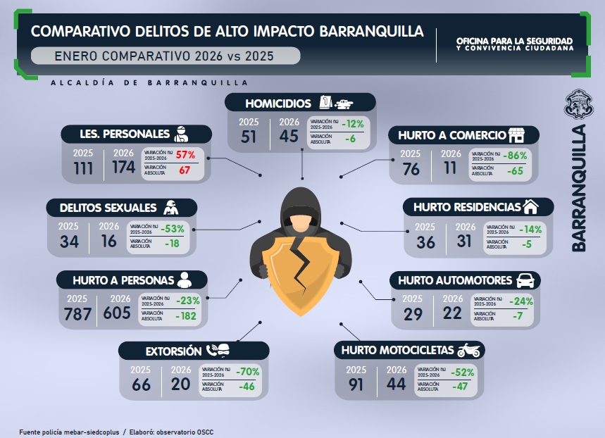 Gracias a la estrategia de seguridad de la Alcaldía de Barranquilla, con diferentes esfuerzos en inversión y operatividad con la fuerza pública, durante el mes de enero los delitos de alto impacto tuvieron una tendencia a la baja.