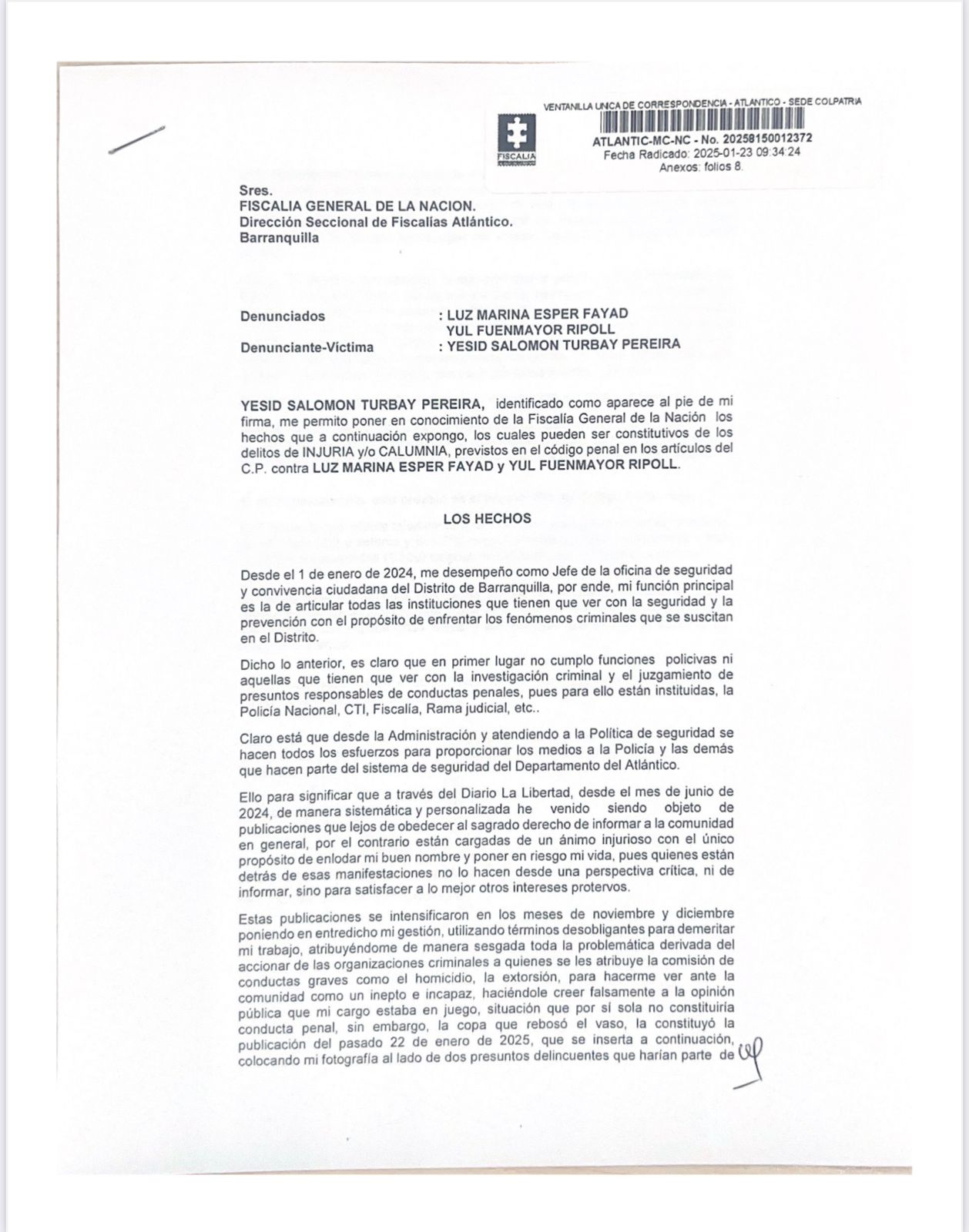 Yesid Turbay, Jefe de la Oficina de Seguridad y Convivencia Ciudadana de Barranquilla, denunció públicamente una serie de publicaciones realizadas por el diario La Libertad que, según él, buscan afectar su buen nombre, reputación y, además, poner en riesgo su integridad y la de su familia.