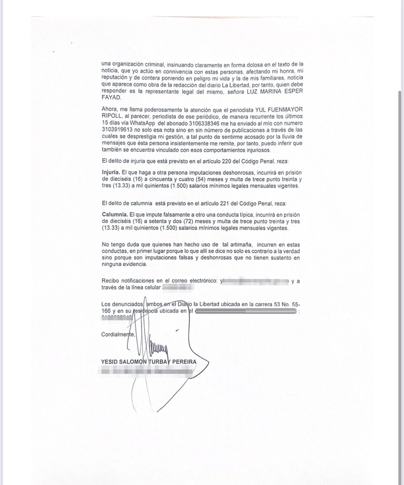 Finalmente, anunció que tomará las acciones legales correspondientes contra La Libertad, representada legalmente por Luz Marina Esper Fayad, y contra las personas que resulten responsables de estas conductas, con el propósito de defender su buen nombre y garantizar su seguridad.