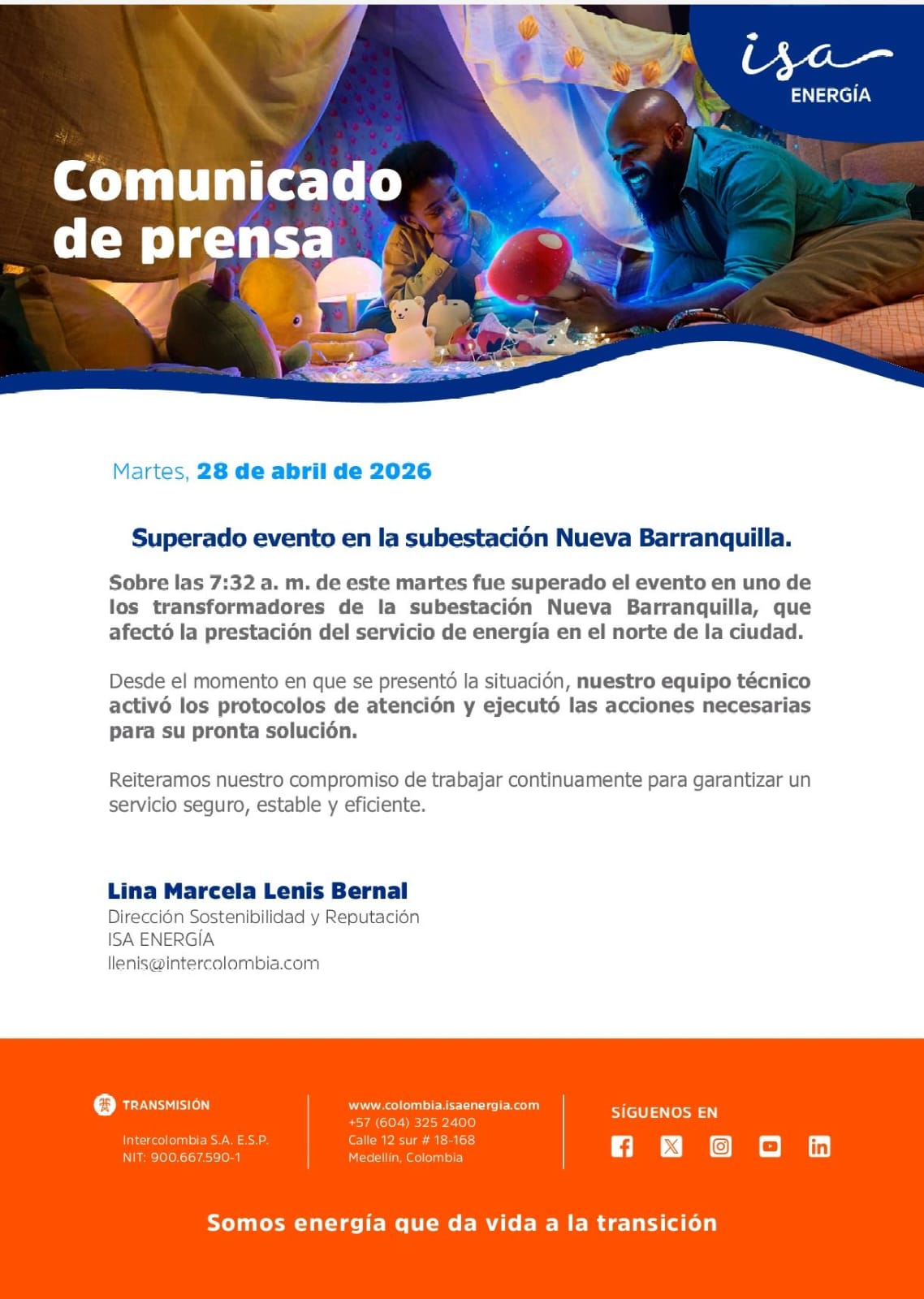 La empresa ISA Energía informó que fue superado el evento técnico registrado en uno de los transformadores de la subestación Nueva Barranquilla, situación que había afectado el servicio de energía en sectores del norte de Barranquilla.