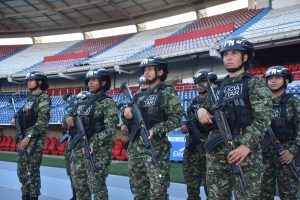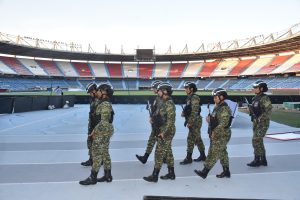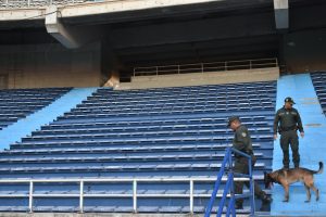 Miembros de diferentes especialidades de la Policía, acompañados por tropas del Batallón de Policía Militar, hicieron recorridos dentro del escenario buscando pólvora, licor, entre otros elementos, en cafeterías, graderías, baños, techos y otros lugares.