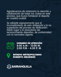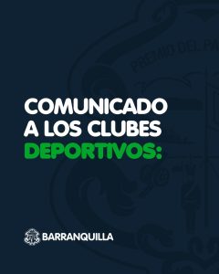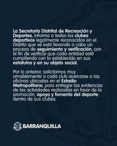 La Alcaldía de Barranquilla, a través de la Secretaría Distrital de Recreación y Deporte, informa a todos los clubes deportivos legalmente reconocidos en el Distrito que se está llevando a cabo un proceso de seguimiento y verificación, con el fin de constatar que cada entidad cumpla con lo dispuesto en sus estatutos y en su objeto social.