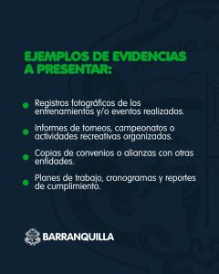 Como parte de las evidencias a presentar, deberán incluirse diversos documentos y registros que respalden las actividades desarrolladas. Entre ellos se encuentran registros fotográficos de entrenamientos y/o eventos realizados; informes detallados sobre torneos, campeonatos o actividades recreativas organizadas; copias de convenios o alianzas establecidas con otras entidades; así como planes de trabajo, cronogramas y reportes de cumplimiento que evidencien la planificación y ejecución efectiva de las acciones programadas.