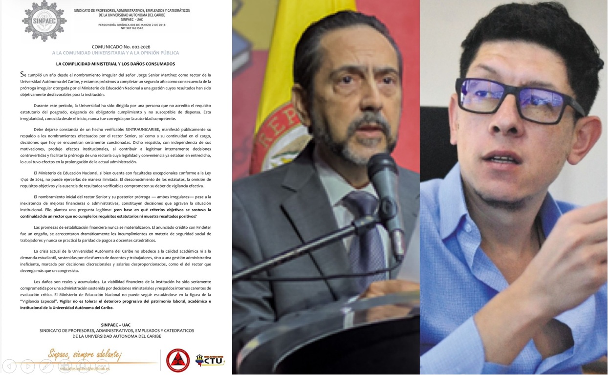 El Sindicato de Profesores, Administrativos, Empleados y Catedráticos de la Universidad Autónoma del Caribe (SINPAEC) responsabilizó al Ministerio de Educación Nacional por la permanencia y prórroga de Jorge Senior Martínez como rector de la Universidad Autónoma del Caribe, pese —según el sindicato— a irregularidades estatutarias y a resultados administrativos desfavorables.