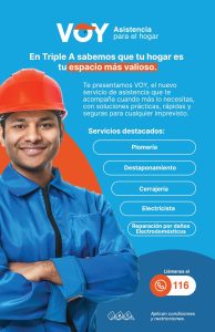 Con el compromiso de estar cada vez más cerca de sus usuarios, Triple A presenta “VOY, Asistencia para el hogar”, un servicio innovador diseñado para atender de manera rápida y confiable imprevistos cotidianos como fugas de agua, puertas dañadas o electrodomésticos que dejan de funcionar en el momento menos esperado.