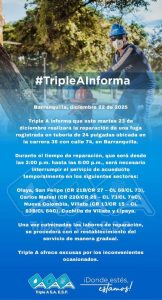 Triple A indicó que, una vez culminen los trabajos, el servicio será restablecido de forma gradual en las zonas afectadas. La empresa ofreció disculpas a la comunidad por las molestias ocasionadas y recomendó a los usuarios almacenar agua con anticipación para atender sus necesidades básicas durante el tiempo de la suspensión.