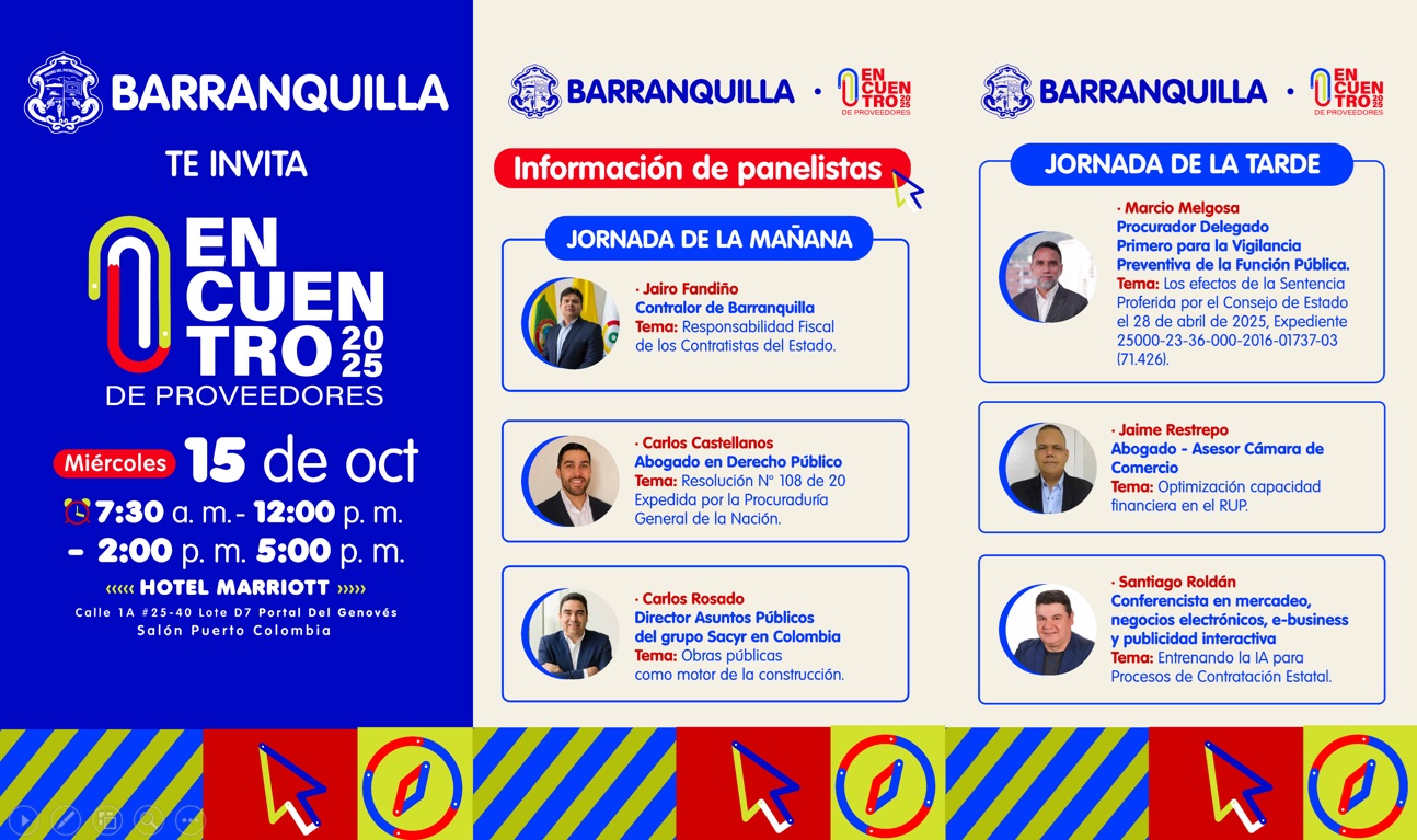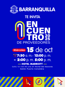 La Alcaldía Distrital de Barranquilla, a través de la Secretaría General y en articulación con la Gerencia de Ciudad, realizará este 15 de octubre el Encuentro de Proveedores 2025. Este evento nace con el propósito de fortalecer la relación entre el Distrito y las empresas, emprendedores y profesionales que desean ofrecer sus bienes y servicios a la administración pública, promoviendo una comunicación más cercana, transparente y efectiva con los proveedores.