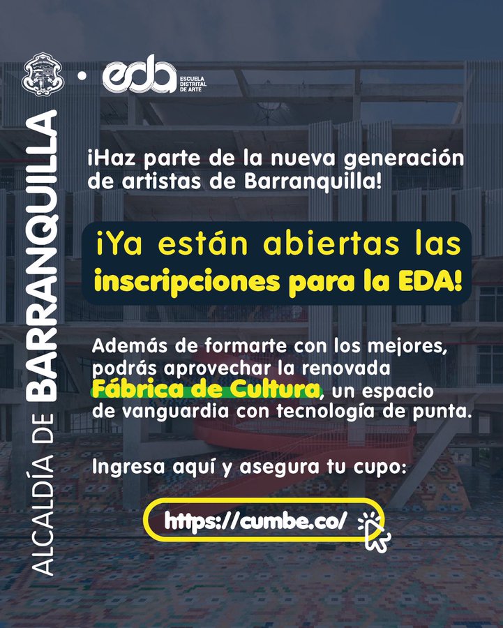 “Ya están abiertas las matrículas de la Escuela Distrital de Arte y Tradiciones Populares (EDA). Invito a todos los jóvenes barranquilleros que sueñan con formarse en música, danza, teatro, producción audiovisual, artes plásticas y más, a que aprovechen esta tremenda oportunidad de estudiar en la Fábrica de Cultura, un espacio de aprendizaje y creatividad con una infraestructura a otro nivel. A ponerse las pilas y asegurar su cupo aquí: https://cumbe.co/”, publicó el alcalde Alejandro Char en su cuenta de X. (Ver publicación).