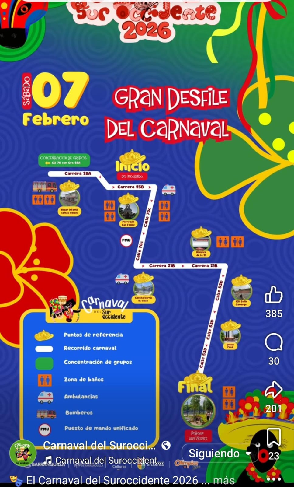 El Carnaval del Suroccidente 2026 tomará este sábado 7 de febrero las calles del sur occidente de la ciudad con un gran desfile folclórico que reunirá música, danza y tradición popular.