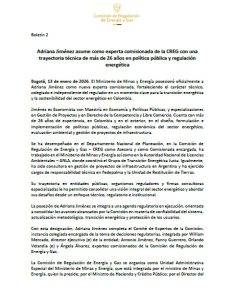 El Ministerio de Minas y Energía posesionó a Adriana Jiménez como nueva experta comisionada de la Comisión de Regulación de Energía y Gas (CREG). Economista de profesión, Jiménez cuenta con más de 26 años de experiencia en política pública y regulación del sector energético, con trayectoria en el MinMinas, la ANLA, el DNP y la propia Comisión.