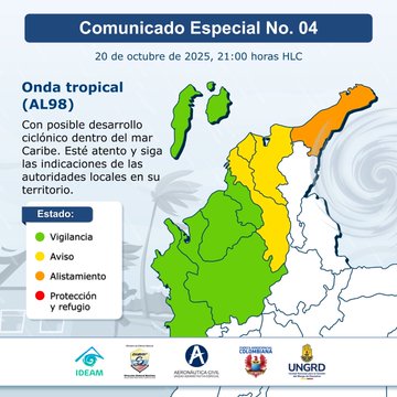 La Mesa Técnica de Alertas de Ciclones Tropicales elevó este lunes en horas de la noche, el nivel de alistamiento máximo en La Guajira ante el fortalecimiento de la perturbación AL98, que presenta un 90 % de probabilidad de desarrollo en las próximas 48 horas.