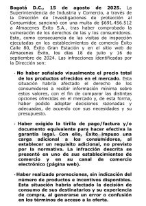 La Superintendencia de Industria y Comercio (SIC) impuso una sanción a Almacenes Éxito por infracciones al régimen de protección al consumidor, con una multa que supera los 691 millones de pesos.