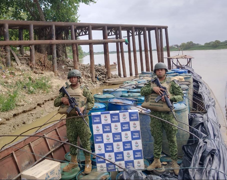 Durante el desarrollo de operaciones de registro y control adelantadas por tropas de la Armada de Colombia, de manera conjunta con el Ejército Nacional en los ríos y vías de los departamentos de Antioquia, Bolívar, Cesar y Chocó, se incautaron diferentes insumos y se ubicaron 25 estructuras ilegales usadas para el procesamiento de sustancias ilícitas.