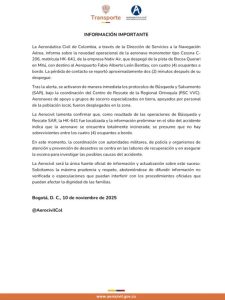 En un comunicado oficial, la Aerocivil informó que, tras las labores de búsqueda y rescate (SAR), la aeronave fue encontrada totalmente incinerada y que, de acuerdo con la información preliminar obtenida en el lugar del siniestro, no hay sobrevivientes entre los cuatro ocupantes.