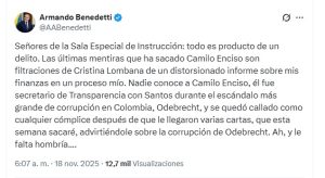 A través de su cuenta en X, Benedetti respondió con dureza a las acusaciones y aseguró que la información divulgada por Enciso proviene de filtraciones ilegales atribuidas a la magistrada de la Corte Suprema Cristina Lombana.