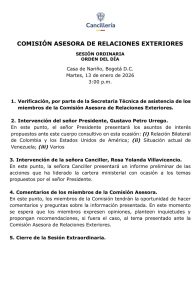 En la agenda está prevista una intervención del presidente Petro, seguida de una presentación de la canciller Rosa Yolanda Villavicencio, quien expondrá un informe preliminar sobre las acciones desarrolladas por la Cancillería frente a estos asuntos prioritarios. Posteriormente, los miembros de la comisión podrán formular comentarios, preguntas y recomendaciones.