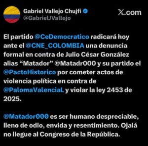 Según Vallejo, la acción responde a presuntos actos de violencia política dirigidos contra la candidata presidencial Paloma Valencia, hechos que —afirmó— vulneran las garantías democráticas y el respeto en el debate electoral.
