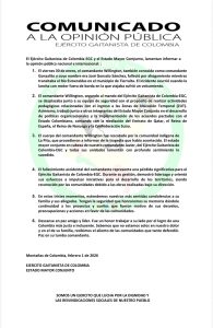 Por medio de este comunicado, el Clan del Golfo confirma la muerte de alias ‘Gonzalito’, por ahogamiento mientras cruzaba el río Esmeraldas tras el volcamiento de la lancha en la que se transportaba.