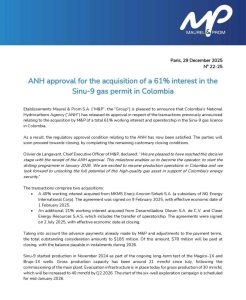 El Gobierno colombiano aprobó la cesión del bloque Sinu-9 a la compañía francesa Maurel & Prom, que ahora opera el 61 % del permiso. Se espera que esta inversión de 185 millones de dólares impulse la producción de hidrocarburos y fortalezca la seguridad energética del país.