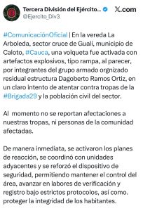 El general Hugo López, Comandante de las Fuerzas Militares de Colombia, confirmó que tras el reciente atentado terrorista registrado en la zona rural del municipio de Caloto, Cauca, las operaciones militares en el norte del departamento continuarán y se intensificarán.