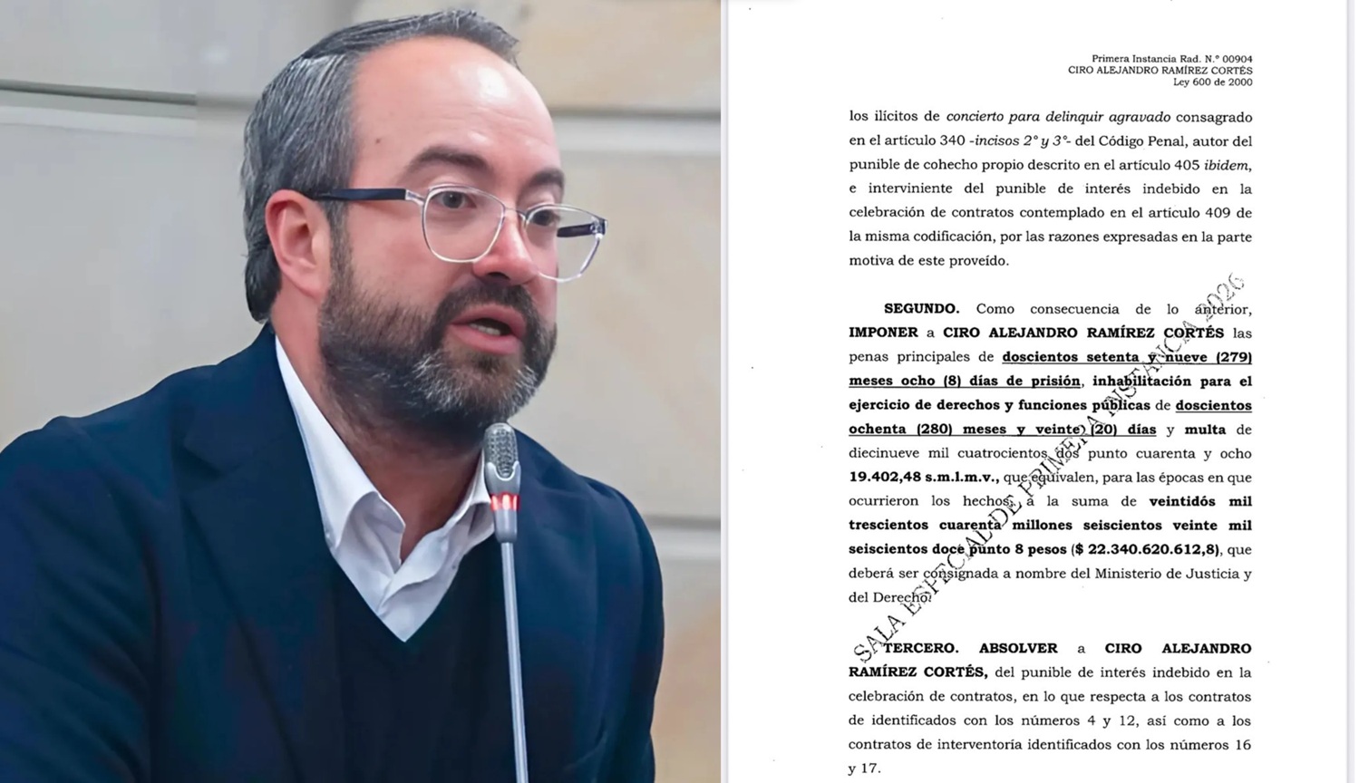La Corte Suprema de Justicia, a través de su Sala de Primera Instancia, condenó a 23 años de prisión al senador del Centro Democrático, Ciro Ramírez, por su responsabilidad en el escándalo de corrupción conocido como ‘Marionetas 2.0’.