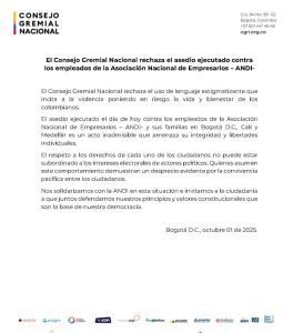 En un comunicado oficial, el Consejo manifestó su solidaridad con la ANDI y con todos los empresarios del país, destacando la importancia de proteger los espacios de trabajo y la labor gremial que impulsa el desarrollo económico y social de Colombia.