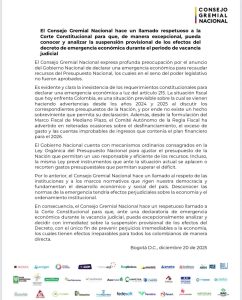 El Consejo Gremial Nacional manifestó su preocupación frente al anuncio del Gobierno Nacional de declarar una emergencia económica, con el propósito de recaudar recursos del Presupuesto General de la Nación que no habrían sido aprobados previamente por el Congreso de la República.