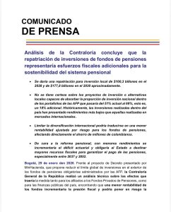 La Contraloría General de la República lanzó una alerta frente a la propuesta del Gobierno Nacional de repatriar cerca de $100 billones correspondientes a los ahorros que actualmente administran los fondos privados de pensiones, al advertir que esta medida podría afectar de forma significativa el monto de las mesadas de los colombianos.