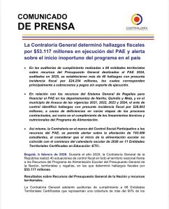 La Contraloría General de la República informó este lunes sobre hallazgos de irregularidades por $53.117 millones en la ejecución del Programa de Alimentación Escolar (PAE) en Colombia, señalando sobrecostos, pagos sin los soportes de ejecución requeridos y problemas en la gestión contractual.