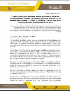 La Corte Constitucional decidió mantener abierto el incidente de desacato contra el ministro de Salud, Guillermo Jaramillo, al considerar que no ha acatado plenamente las órdenes impartidas para el reajuste de la Unidad de Pago por Capitación (UPC) y la garantía del derecho fundamental a la salud.