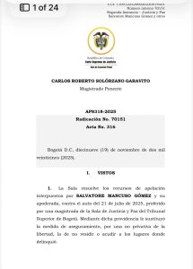 La Corte Suprema de Justicia confirmó una decisión adoptada por la Sala de Justicia y Paz que restringe la movilidad y residencia del exjefe paramilitar Salvatore Mancuso, quien no podrá vivir en Montería ni permanecer en ocho departamentos en los que tuvo amplia influencia mientras fue comandante de las Autodefensas Unidas de Colombia (AUC).