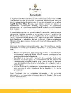 A través de un comunicado oficial, la entidad señaló que la contratación responde a una necesidad institucional histórica y está relacionada con la misionalidad del Dapre, desvirtuando cuestionamientos sobre posibles irregularidades.
