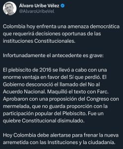 La publicación ha sido leída por analistas como un intento de construir un frente común en defensa del orden constitucional, en momentos en que se intensifica la confrontación entre el Ejecutivo y el Congreso por las reformas impulsadas por el presidente Petro.