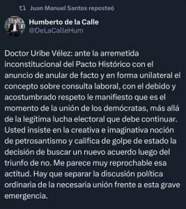 El mensaje, difundido a través de la red social X y replicado por el expresidente Juan Manuel Santos, plantea un inusual acercamiento entre figuras que han sido tradicionalmente rivales. “Presidente Uribe: diferencias enormes nos separan. Pero lo invito a rechazar juntos la arremetida inconstitucional del Pacto Histórico”, escribió De la Calle, exjefe negociador del proceso de paz con las FARC.