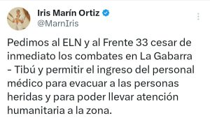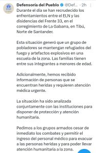 “Pedimos a los grupos armados cesar de inmediato los combates y permitir el ingreso del personal médico para evacuar a las personas heridas y poder llevar atención humanitaria a la zona”, señaló la Defensoría en su pronunciamiento.