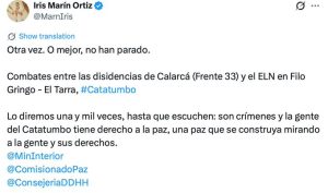 Frente a estos hechos, la defensora del pueblo, Iris Marín, se pronunció con contundencia, calificando las acciones como “crímenes” y reiterando la urgencia de garantizar los derechos de la población civil.