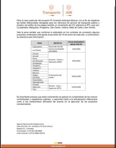Estos aumentos adicionales, precisó la ANI, responden a compromisos contractuales previamente acordados y están destinados a cubrir la financiación, operación, mantenimiento y mejora de las vías concesionadas en diferentes regiones del país.