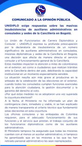 La Unión de Funcionarios de Carrera Diplomática y Consular expresó su preocupación por los despidos masivos que se vienen registrando en consulados y sedes de la Cancillería en la capital.
