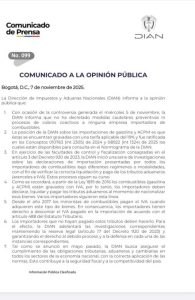 En un comunicado oficial emitido este 7 de noviembre, la entidad aclaró que no ha decretado medidas cautelares ni procesos de cobro coactivo contra ninguna empresa importadora de gasolina o diésel.
